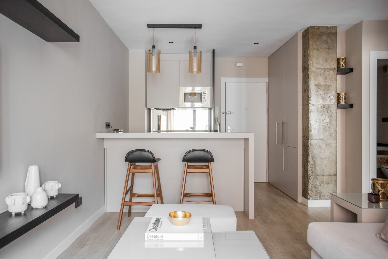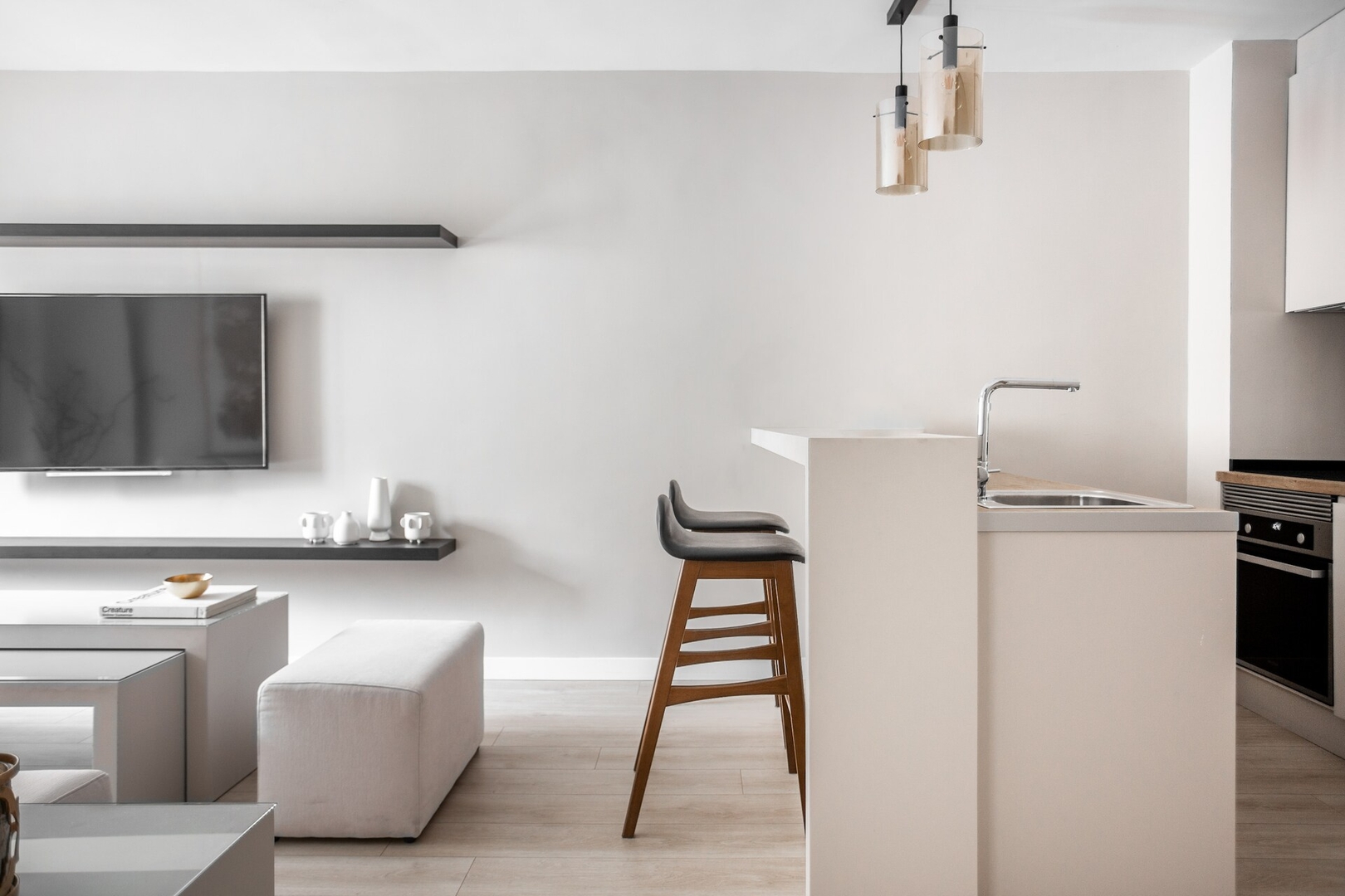 El alojamiento se distribuye en un salón con gran luminosidad, junto a la cocina en concepto abierto, y una cómoda barra dónde comer.