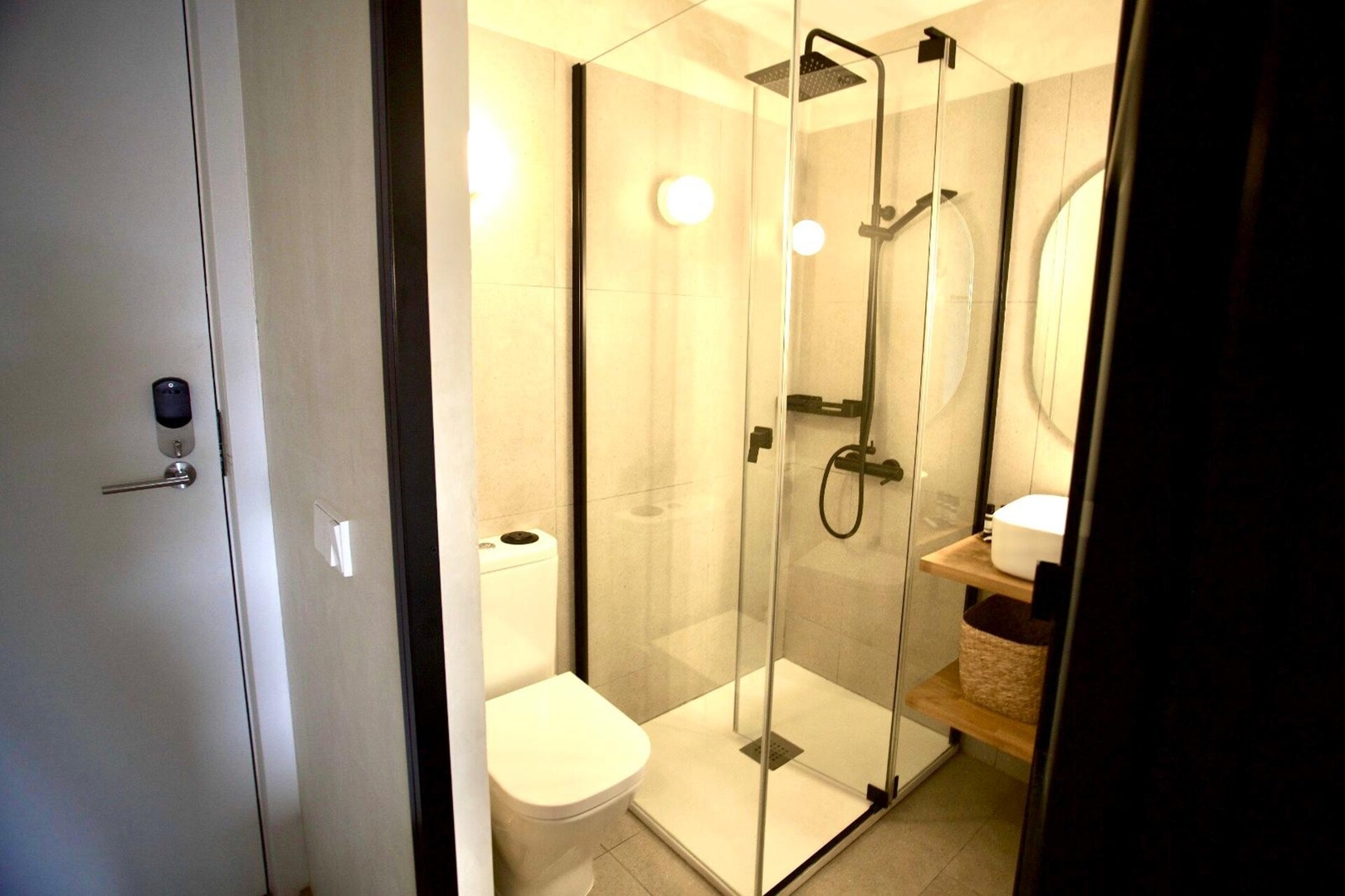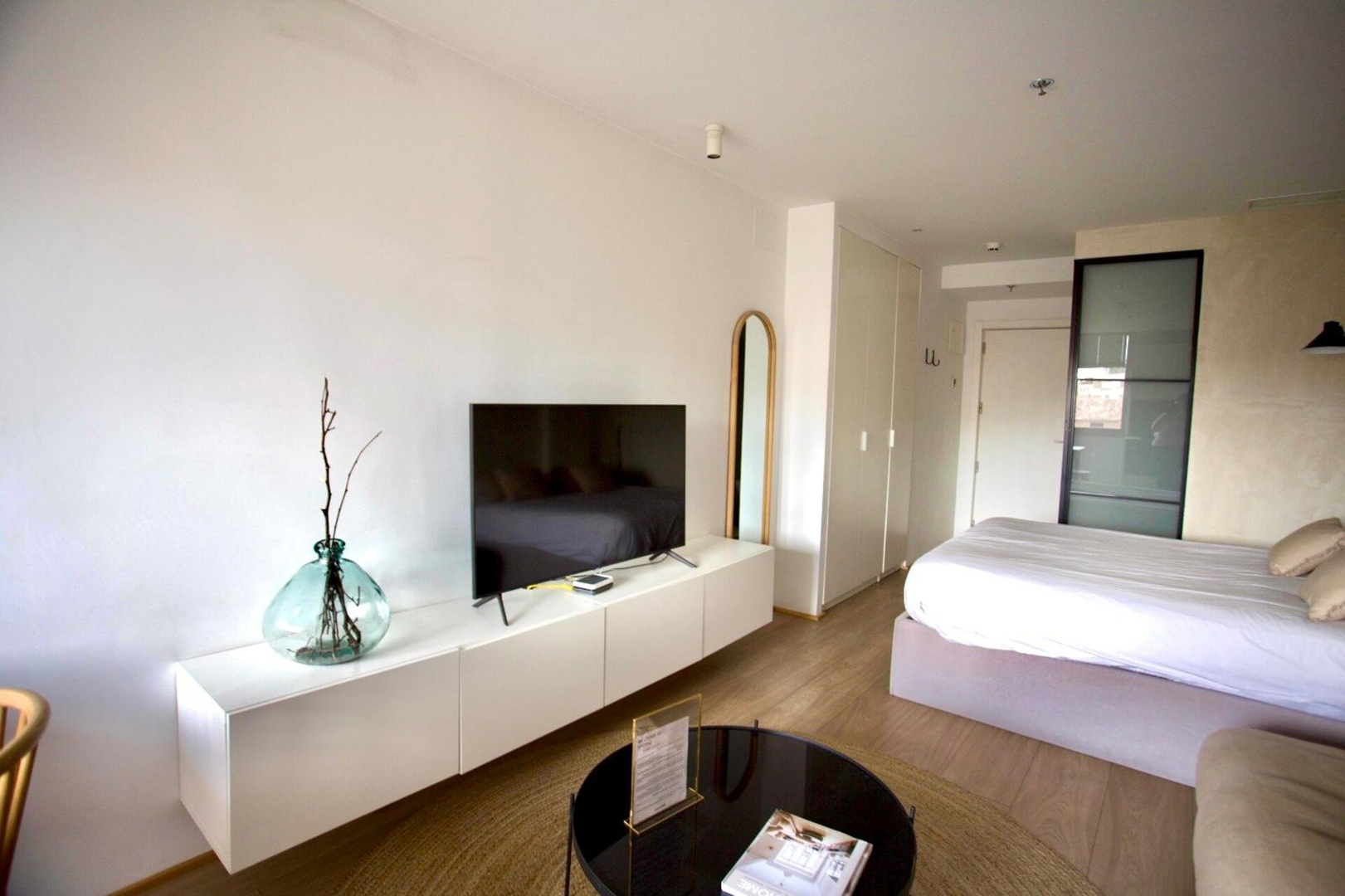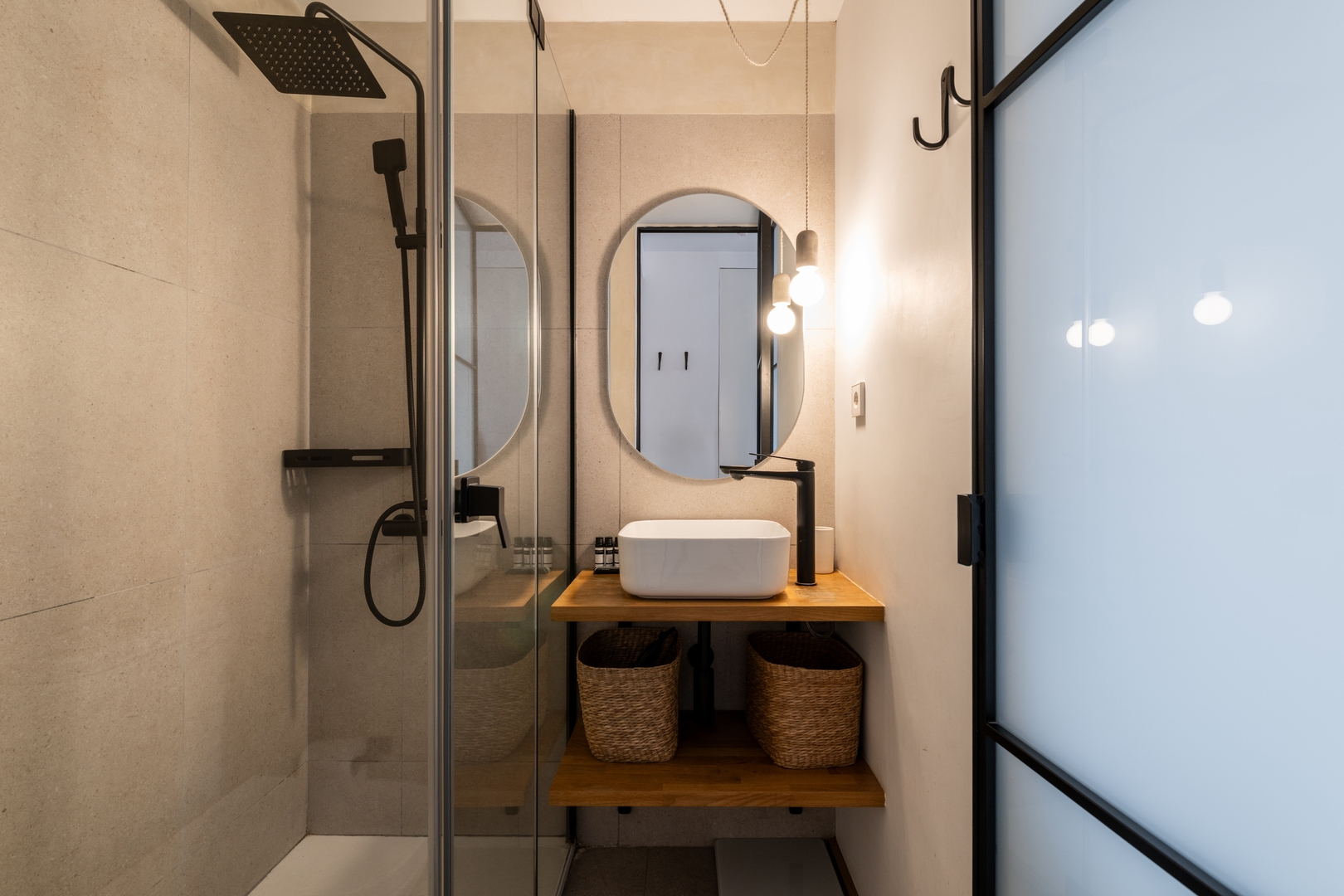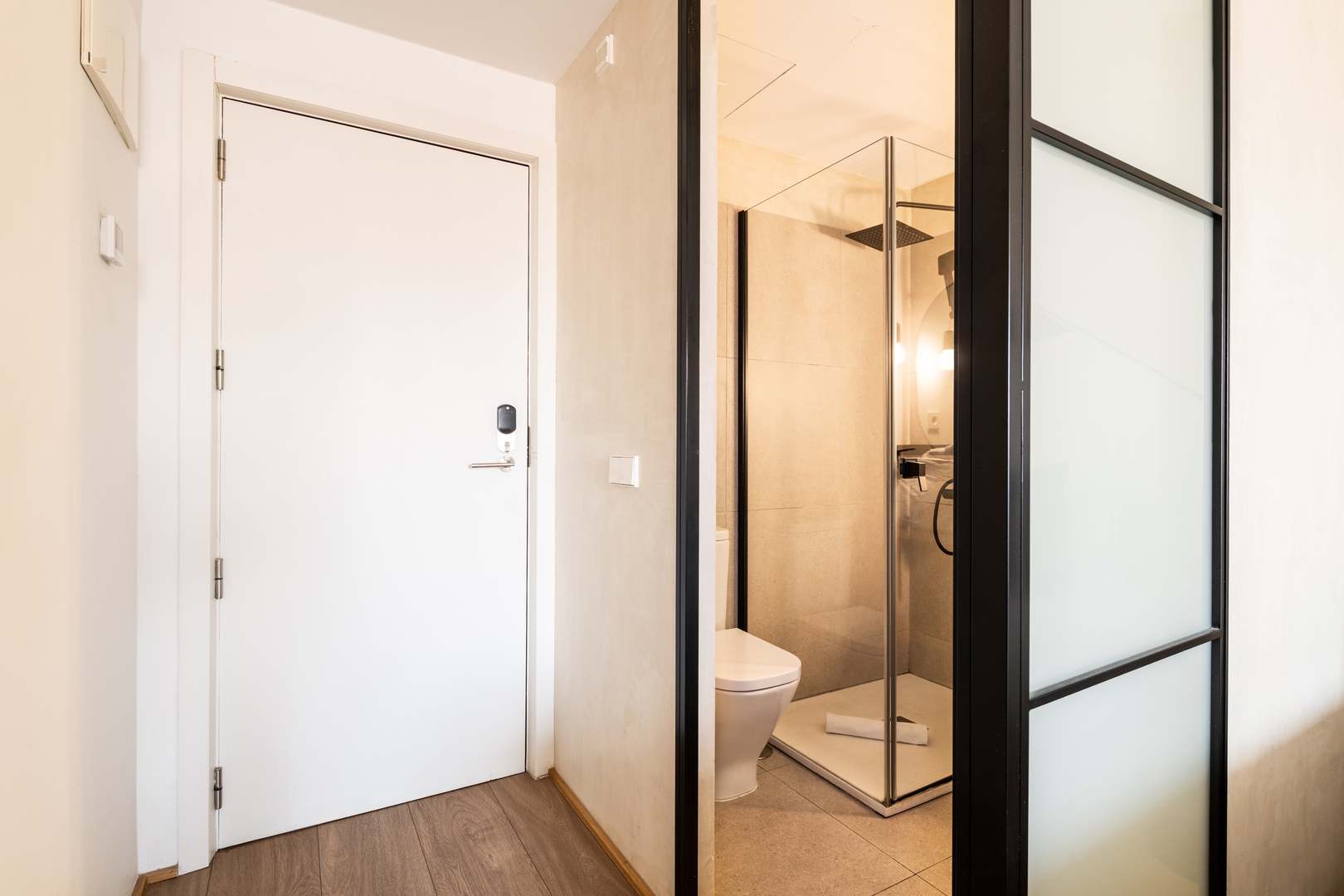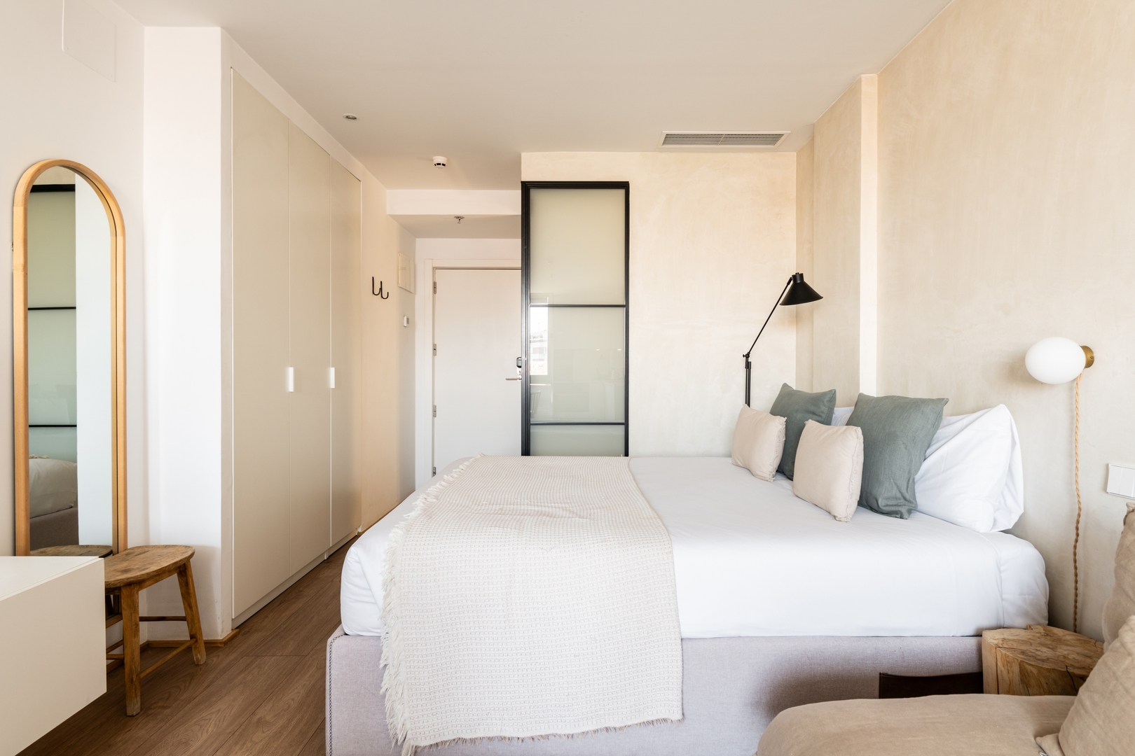 Séptima planta exterior. Se distribuye en dos ambientes: dormitorio y salón-cocina. El dormitorio dispone de cama queen size, luces de lectura, dos mesillas de noche de diseño y armarios empotrados dobles y multifuncionales. El salón, de diseño minimalista mediterráneo, dispone de un cómodo sofá. A su vez, cuenta con una mesa que se puede utilizar como comedor o para teletrabajar.