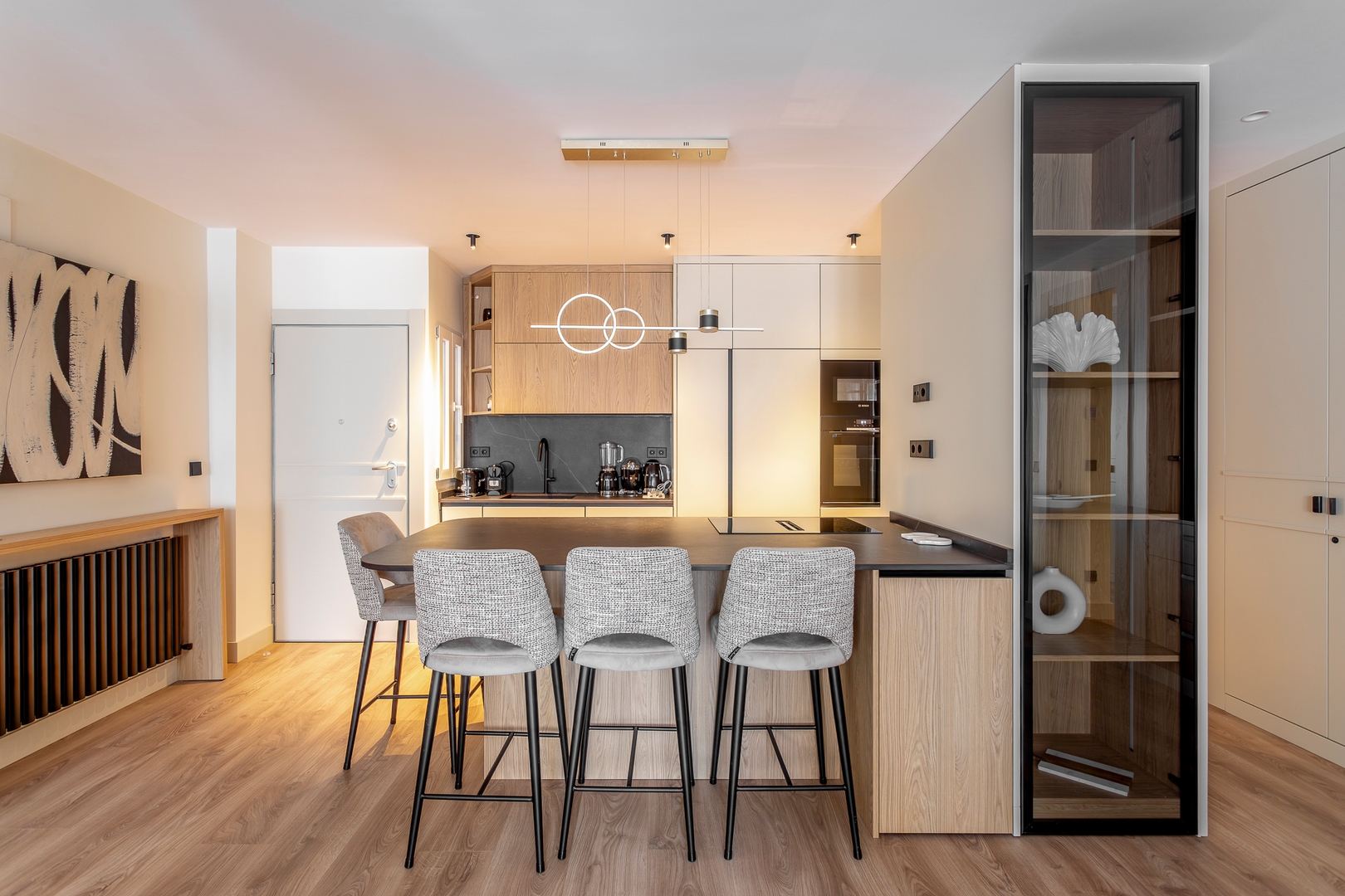 ALOJAMIENTO EXCLUSIVO Este luminoso apartamento ofrece una experiencia sofisticada junto al Parque del Retiro, en una de las mejores zonas de Madrid. Cuenta con tres habitaciones dobles con baño en suite, y un aseo de cortesía. El salón-comedor con cocina abierta, ventanales y pequeña terraza a la calle Doctor Castelo garantiza un ambiente amplio y lleno de luz. La cocina está equipada con electrodomésticos de alta gama, incluyendo Smeg y cafetera Nespresso.